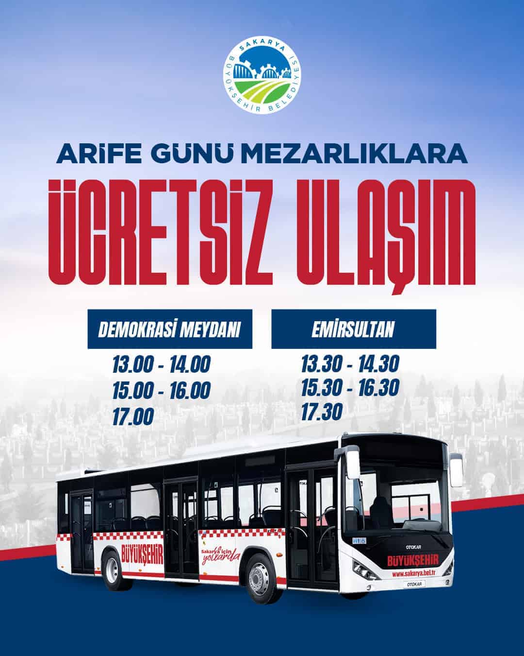Arefe günü saat 13.00 itibariyle başlayacak olan otobüs seferleri, Demokrasi Meydanı’ndan hareket ederek Emirdağ ve Emir Sultan Mezarlıklarına ücretsiz ulaşım sağlayacak. Otobüsler her saat başında kalkacak ve hizmet saat 17.00’ye kadar devam edecek.