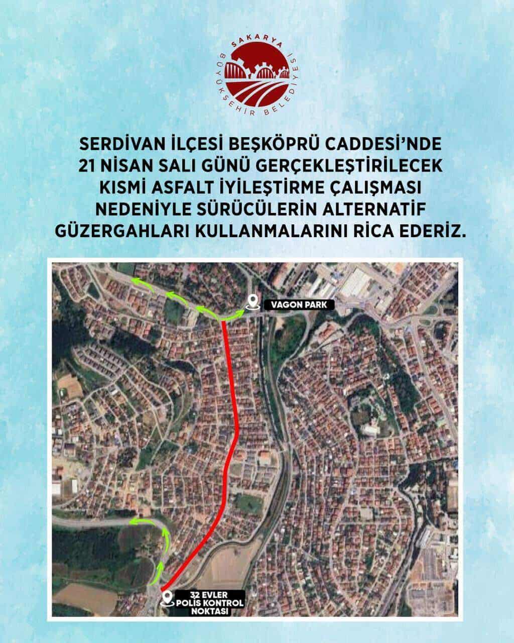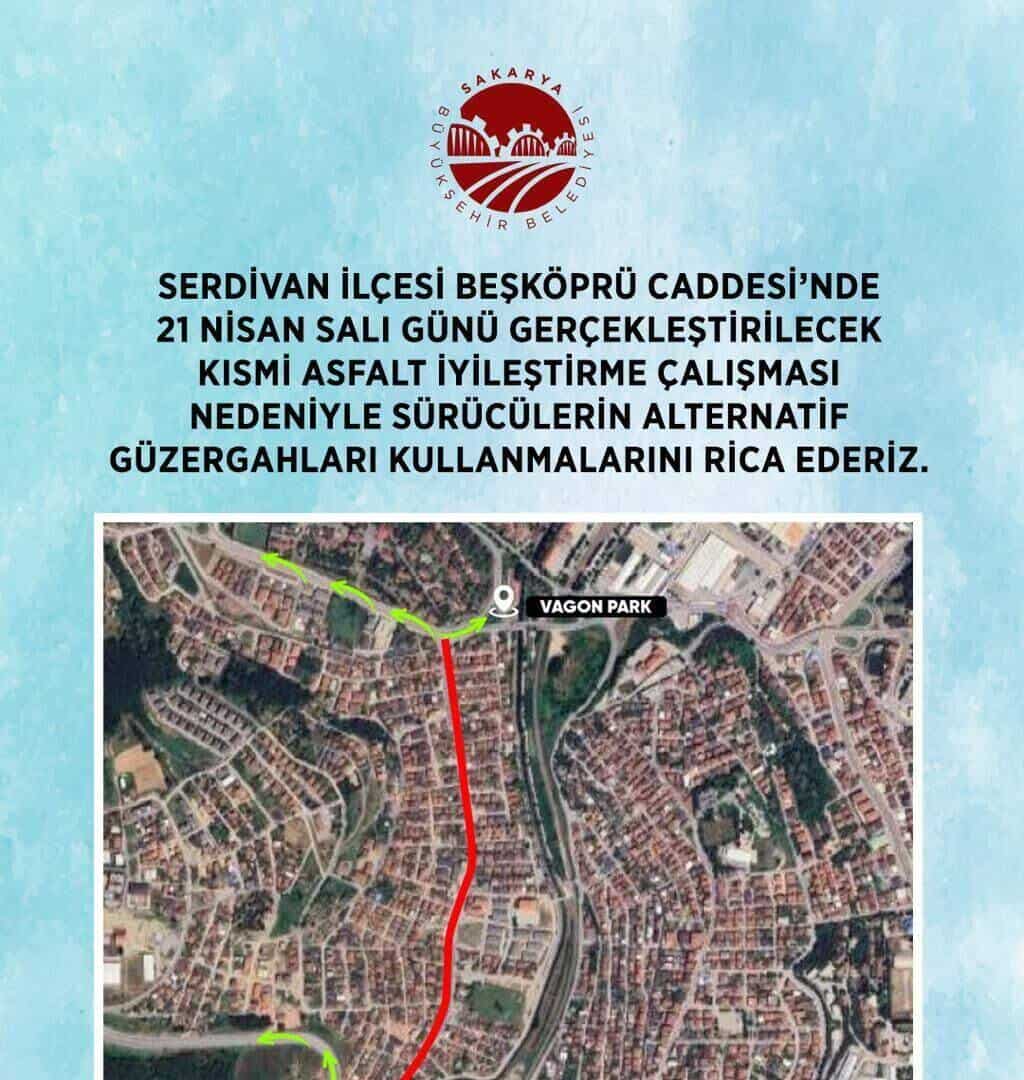 Sakarya Büyükşehir Belediyesi, Serdivan Beşköprü Caddesi üzerinde 21 Nisan Salı günü kapsamlı asfalt iyileştirme çalışması yapılacağını duyurdu. Tüm gün sürecek olan çalışmalar nedeniyle güzergah trafik akışı açısından etkilenecek.
